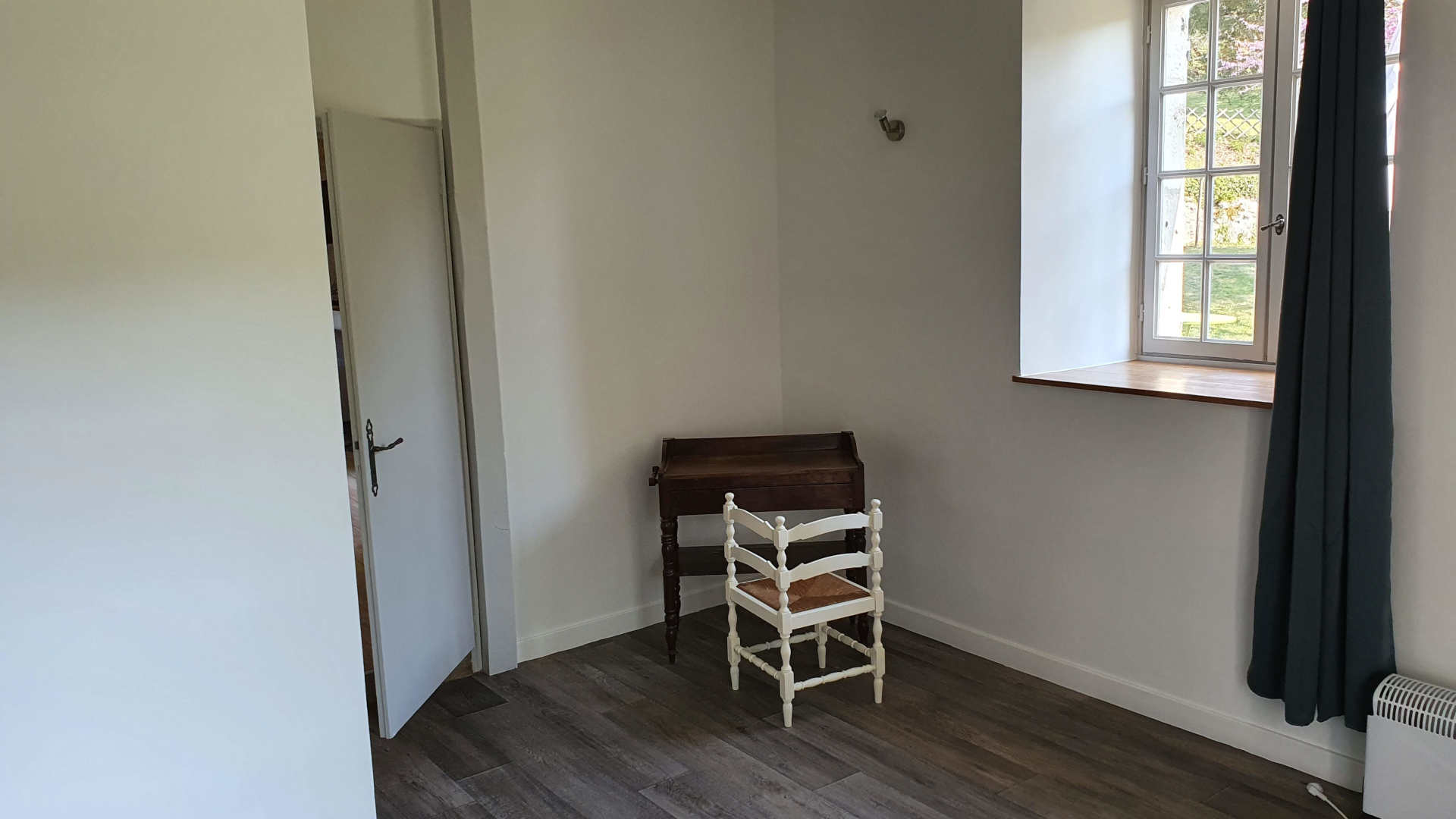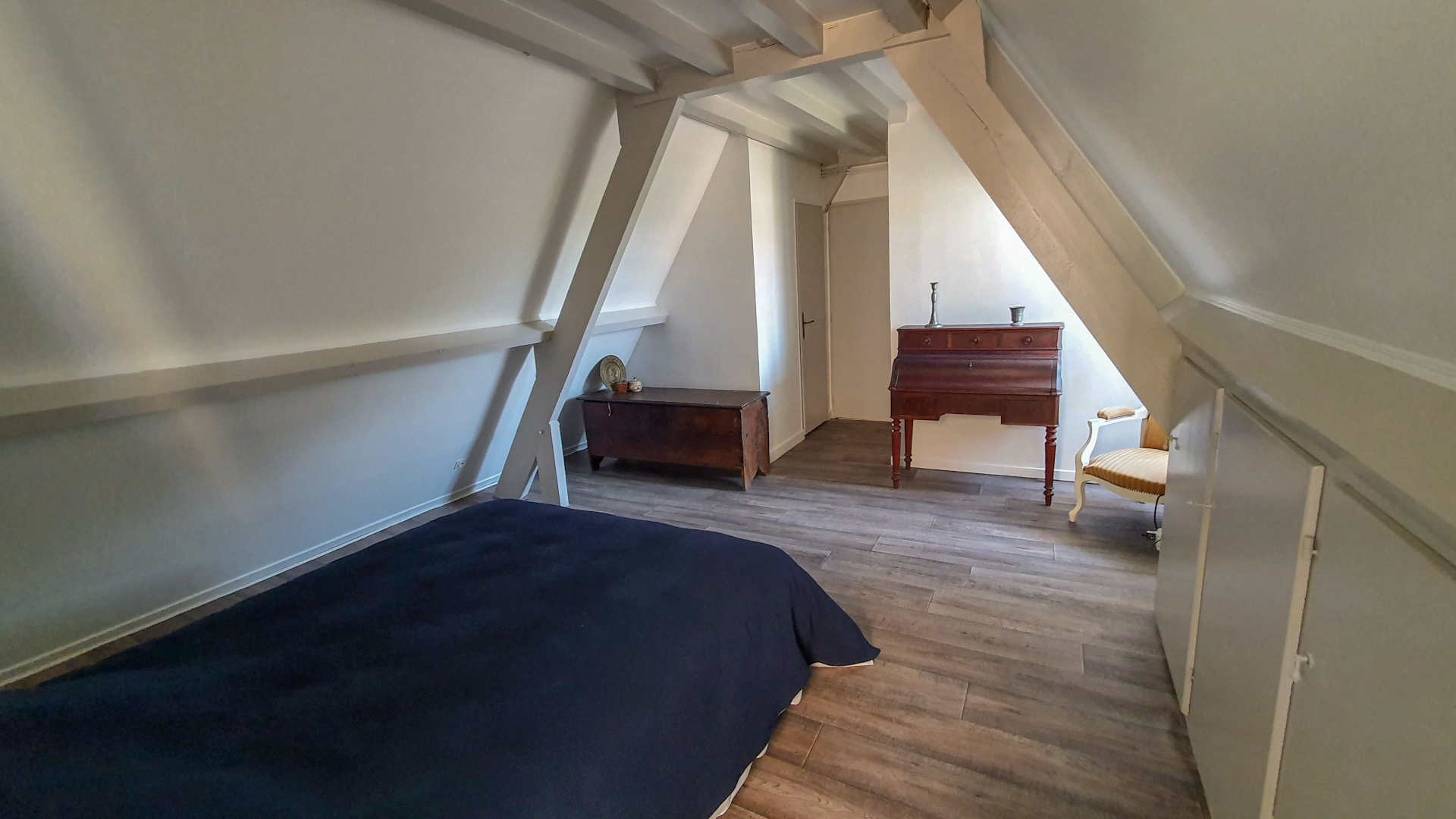 Chambre 1 : lit 160×200 avec bureau et chaise, armoire, méridienne et table basse.