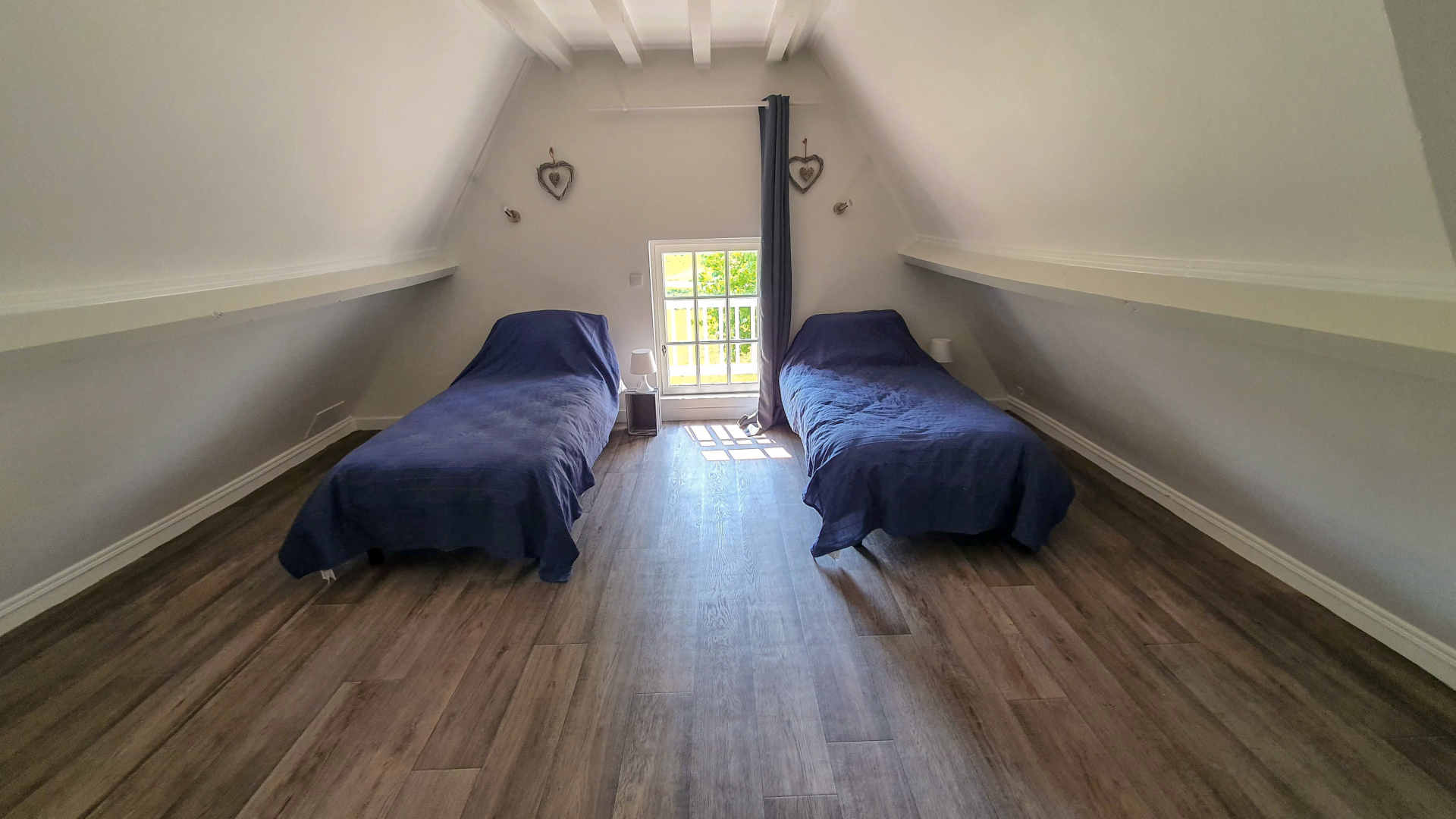 Au 1er étage, vous trouvez une première chambre avec un lit double (160 x 200), une salle de bains avec WC, et une deuxième chambre avec deux lits simples (90 x 190).