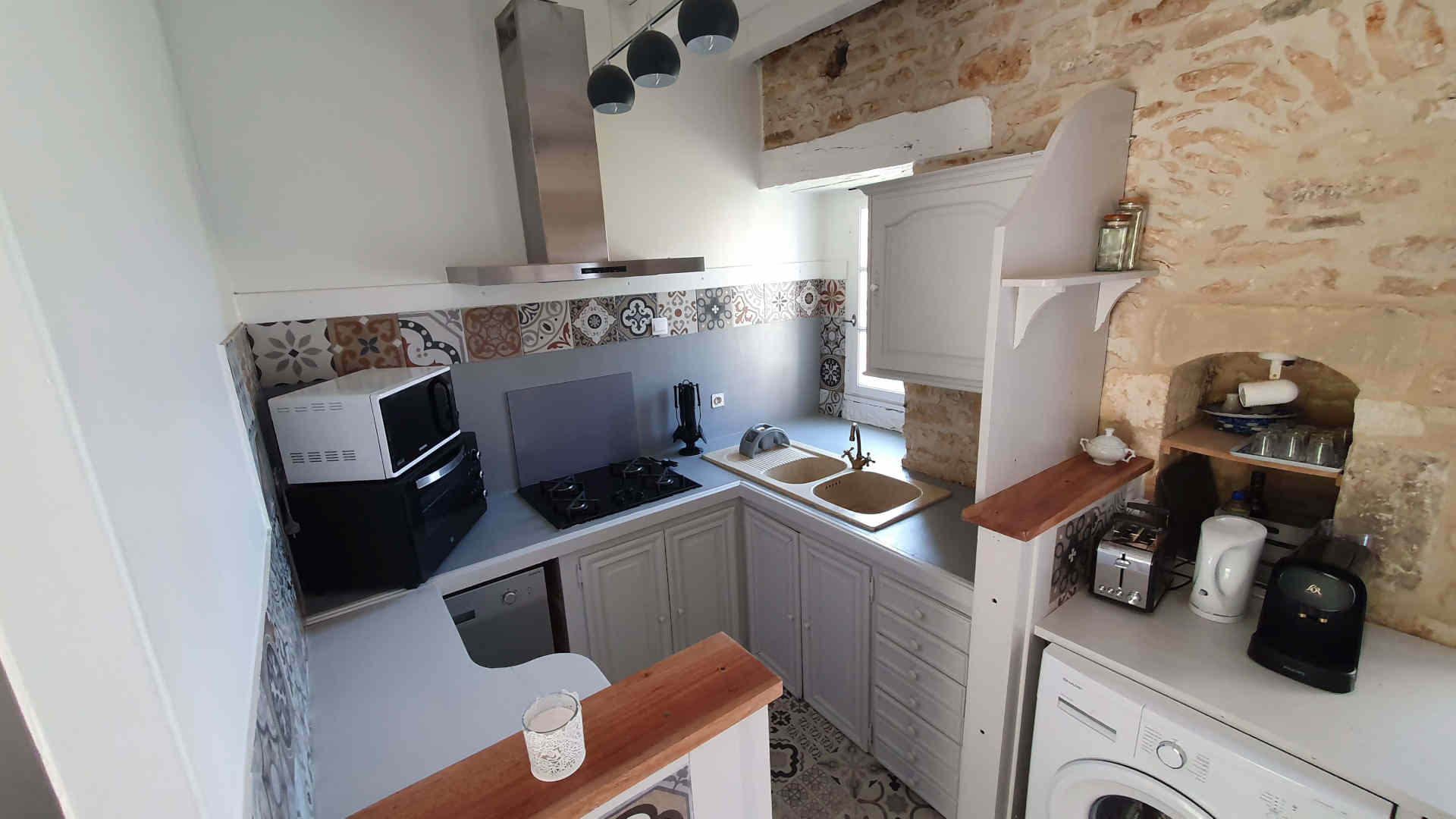 Espace cuisine ouvert avec un bar, rangement et plans de travail, évier, 4 feux gaz, un four électrique, un lave vaisselle, un réfrigérateur avec un freezer, lave-linge. Une porte vitrée accès terrasse privative et son barbecue ainsi qu’au jardin avec ses bancs sculptés dans la pierre.