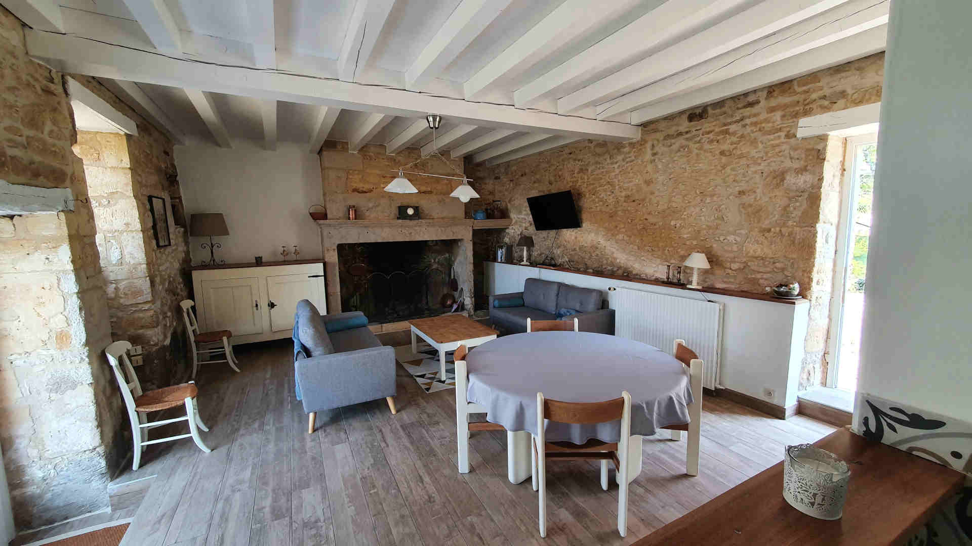 Pièce à vivre avec une table et chaises, un buffet vaisselier, une cheminée , canapé et fauteuils, une table basse, TV écran plat.