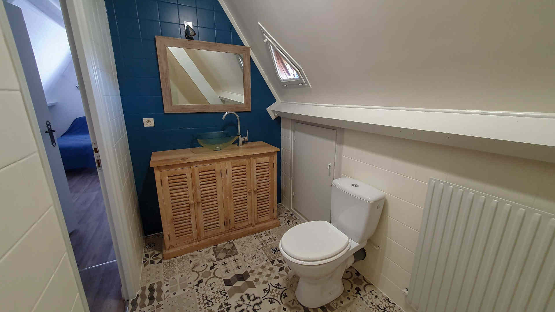 Salle d’eau privative : douche, vasque, rangements, WC, sèche serviettes.