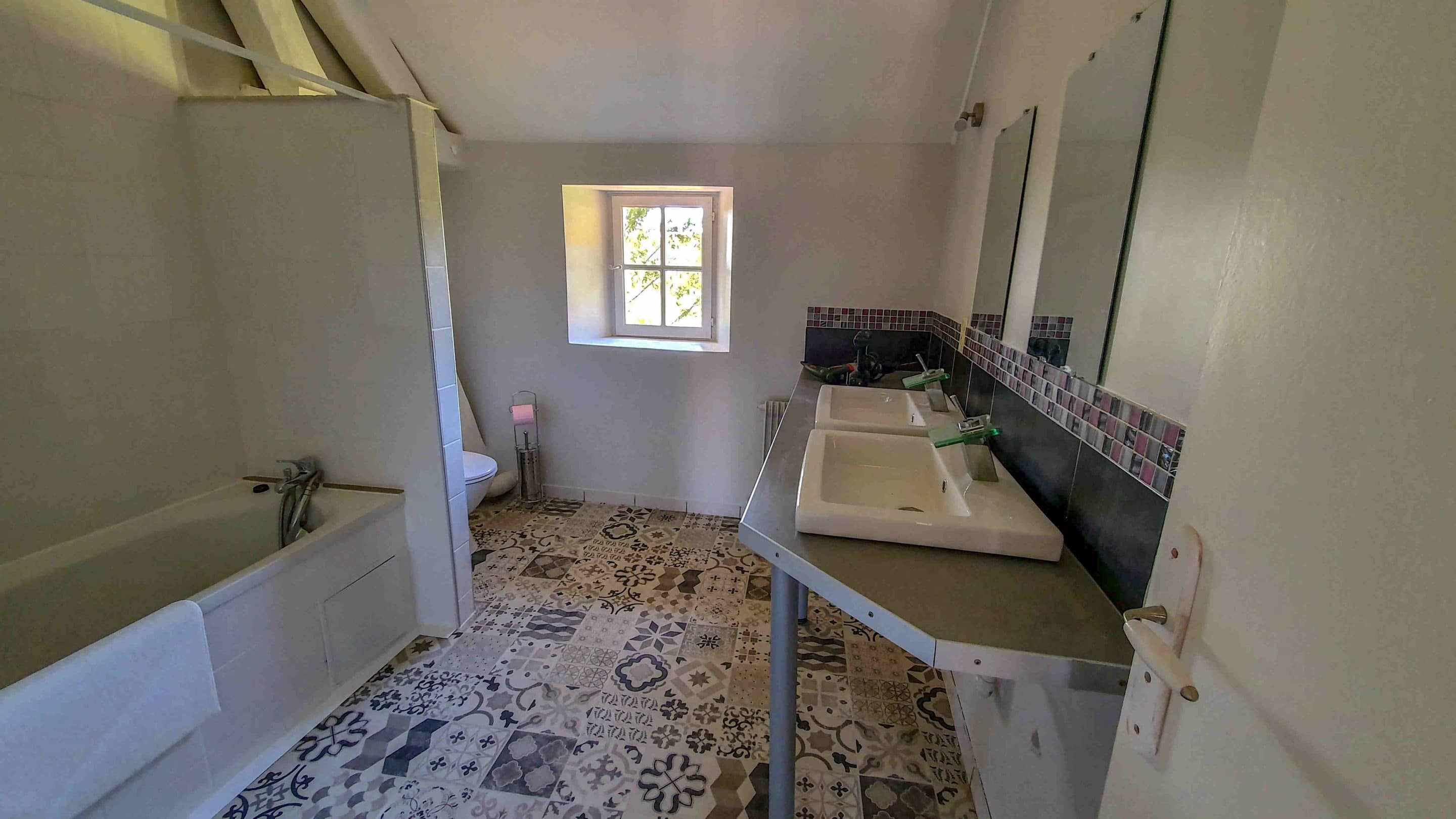 Salle de bain : baignoire avec double vasque, meuble de rangement, WC.