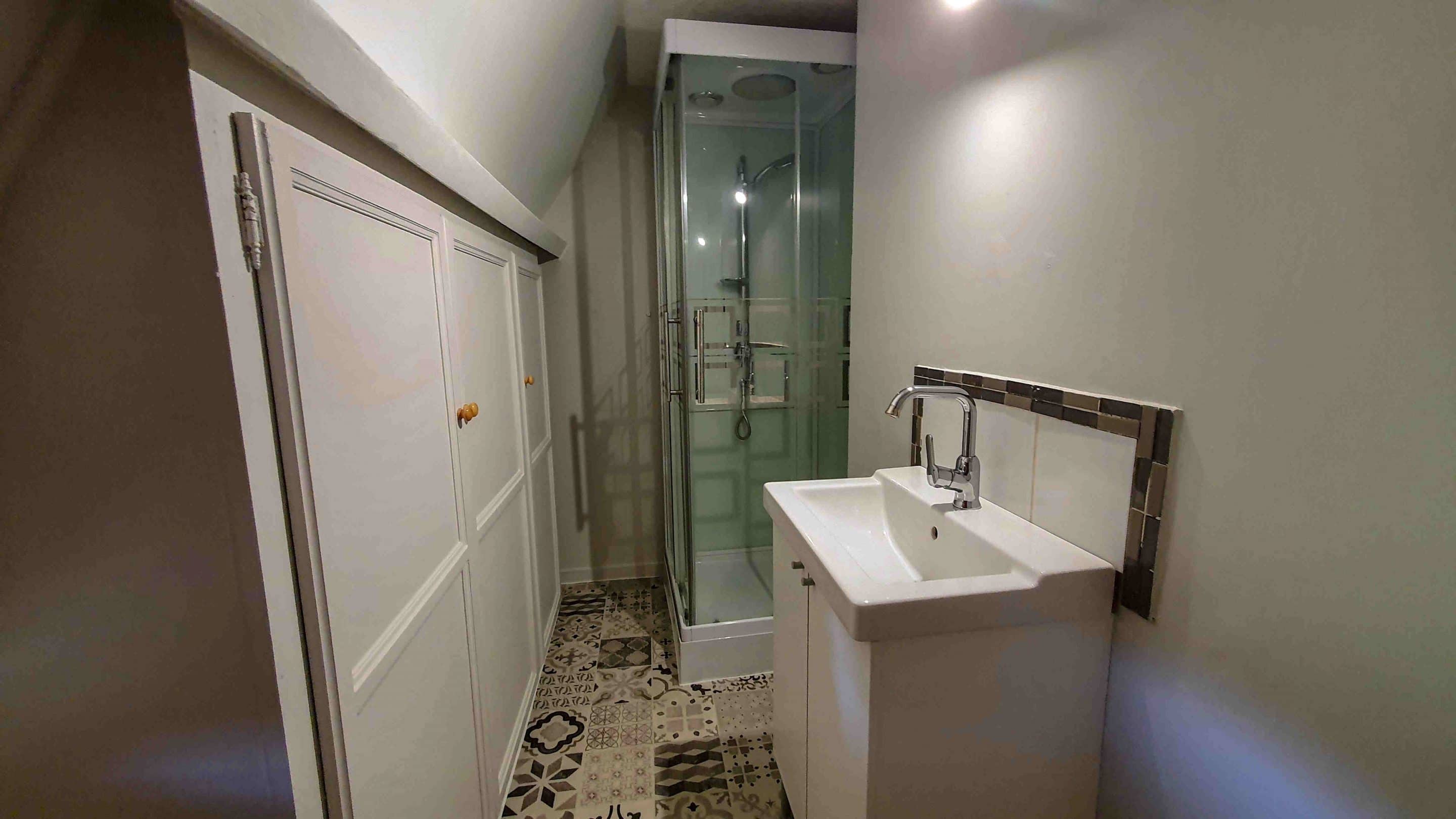 Au 1er étage, vous trouverez une salle de bains avec WC, deux chambres avec chacune un lit double (160 x 200), et une pièce palière avec canapé convertible.
